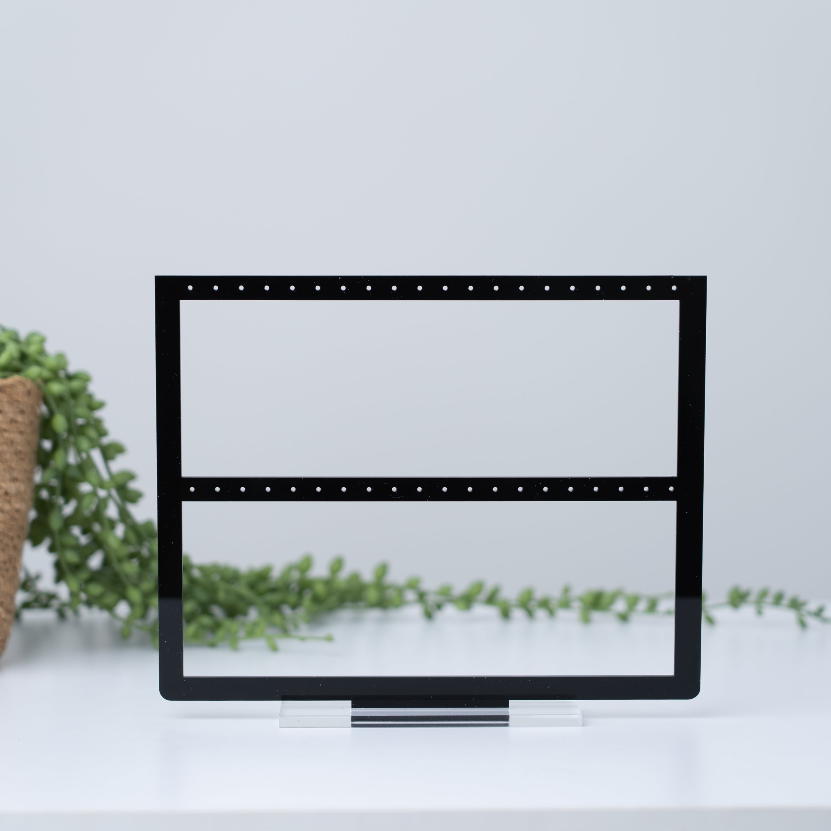 Deze display is 18cm hoog en 21,5cm breed en 3mm dik, gemaakt in ons eigen atelier. Voorzien van 40 gaatjes, er kunnen dus maximum 20 paar oorbellen aan. Beschikbaar in goud, zwart of transparante kleur.