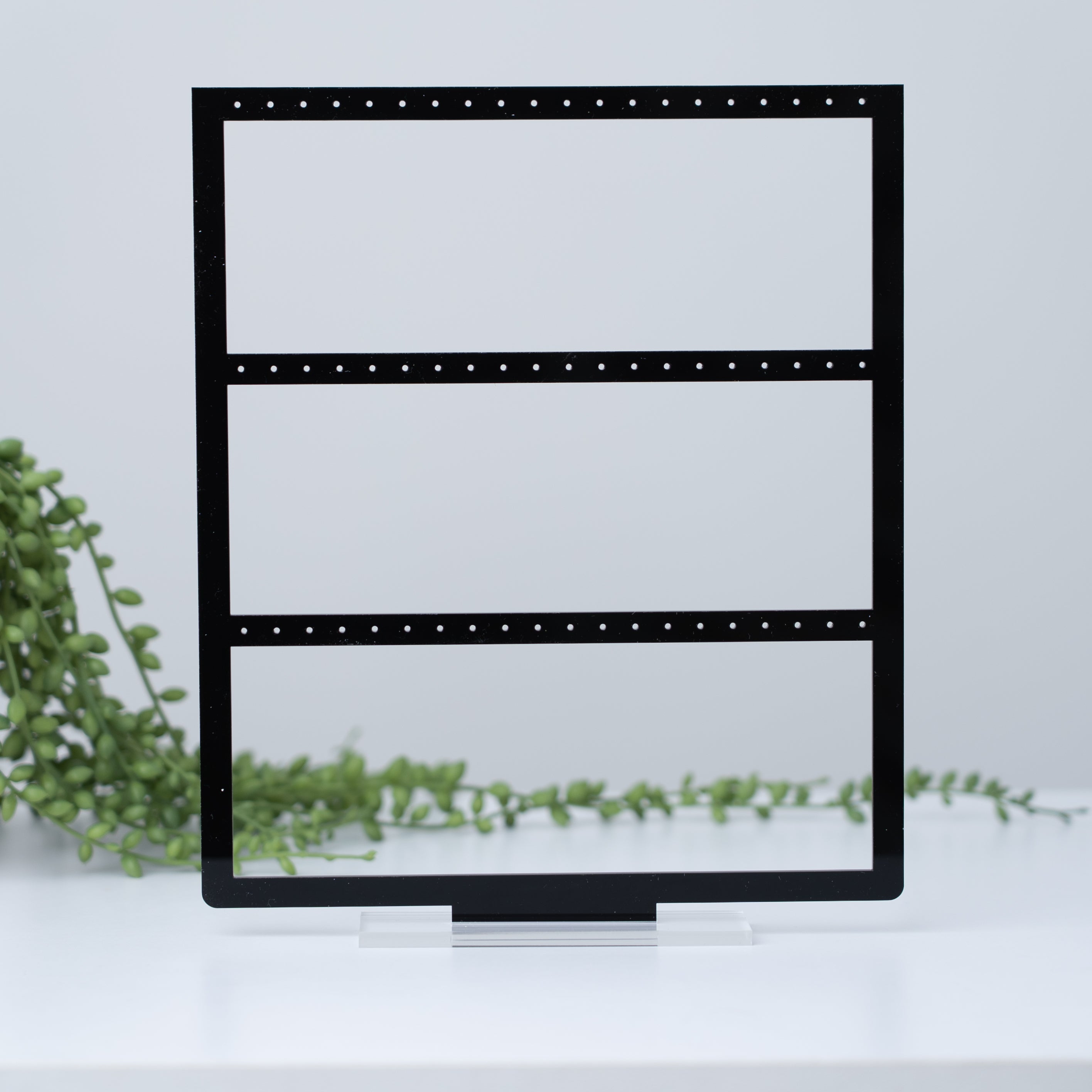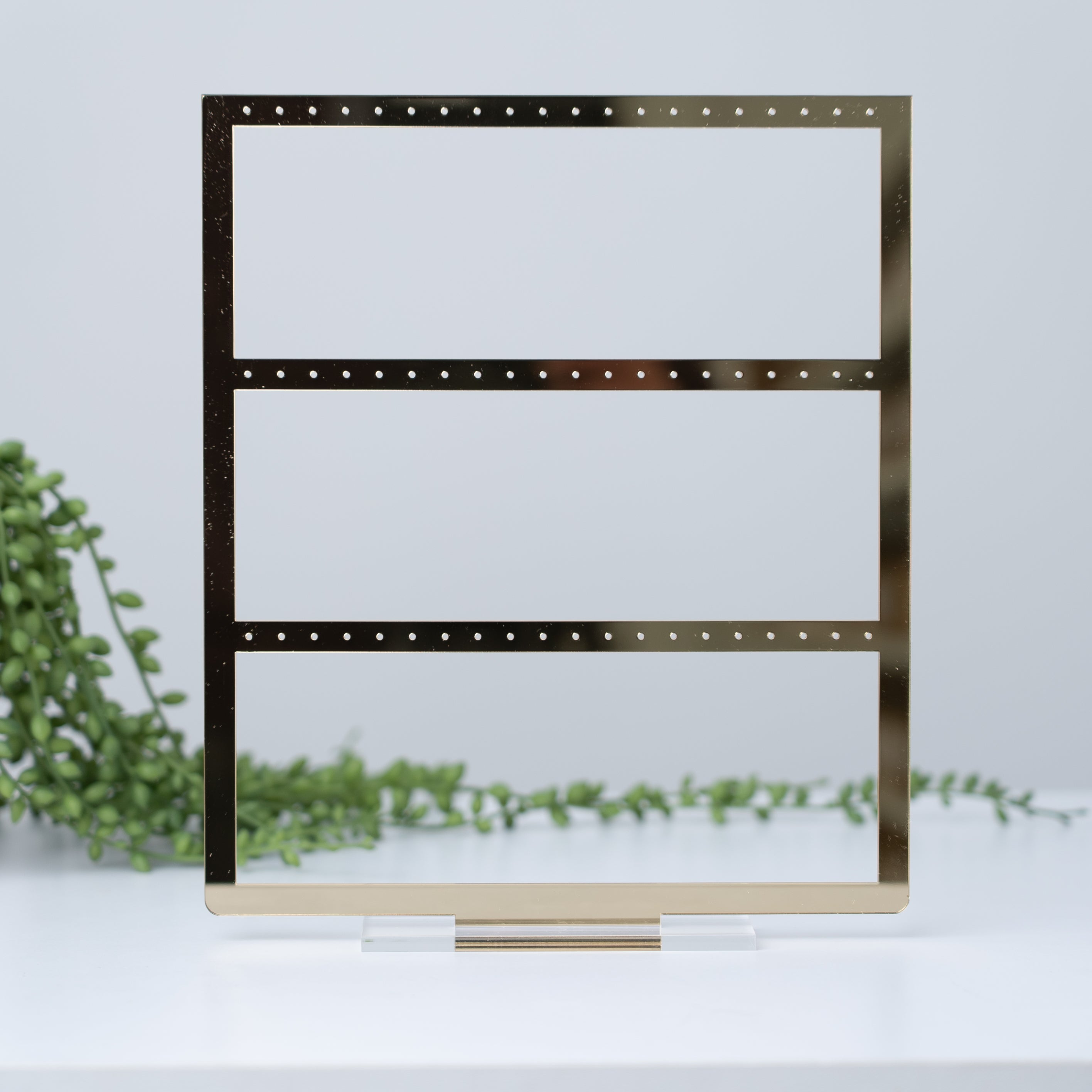 Deze display is 26cm hoog en 21,5cm breed en 3mm dik, gemaakt in ons eigen atelier. Voorzien van 60 gaatjes, er kunnen dus maximum 30paar oorbellen aan. Beschikbaar in goud, zwart of transparante kleur.